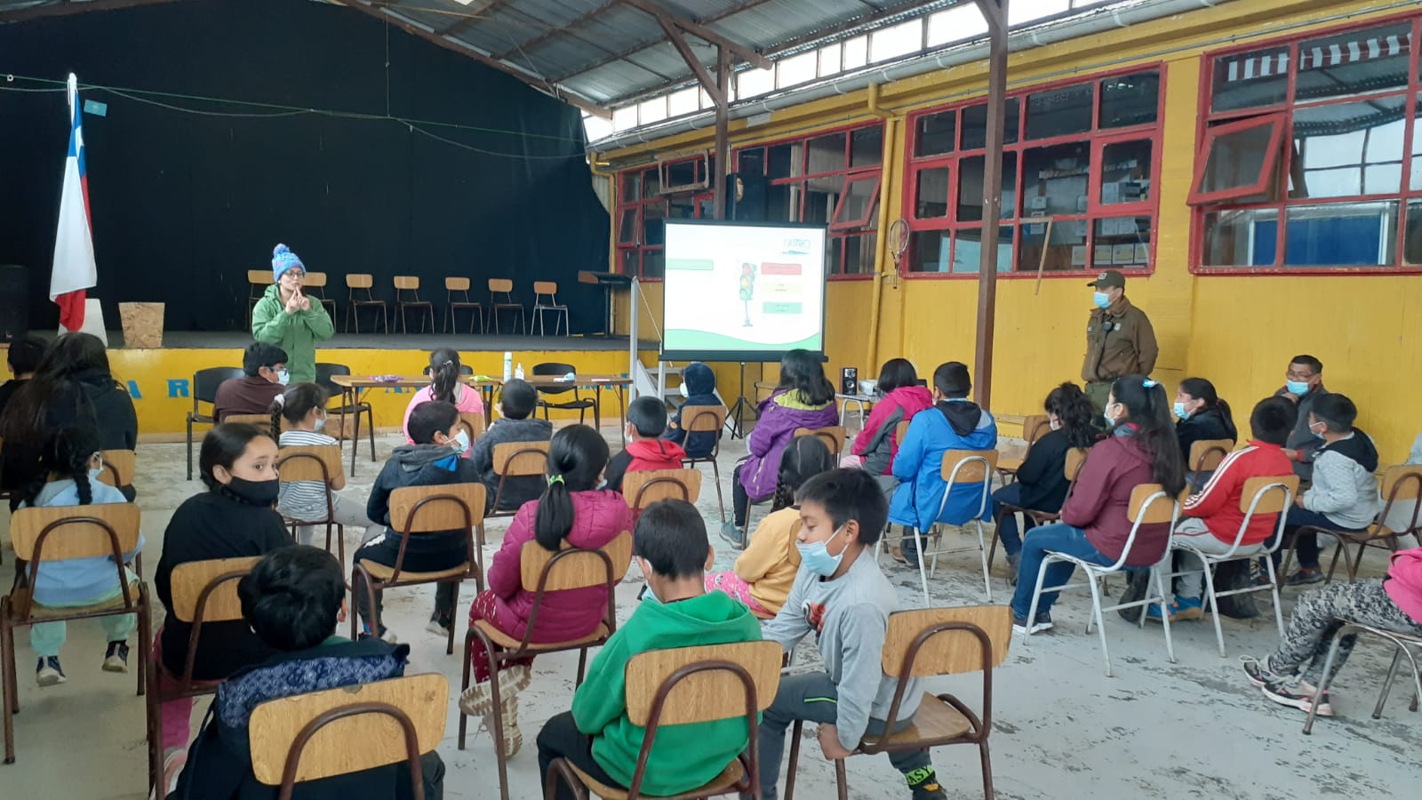 Los profesionales de la Dirección de Seguridad Pública y del programa Senda Previene de la Dirección de Desarrollo Comunitario de Castro Municipio estuvieron en las escuelas de Los Ángeles y Peldehue hablando con niños, niñas y profesores.