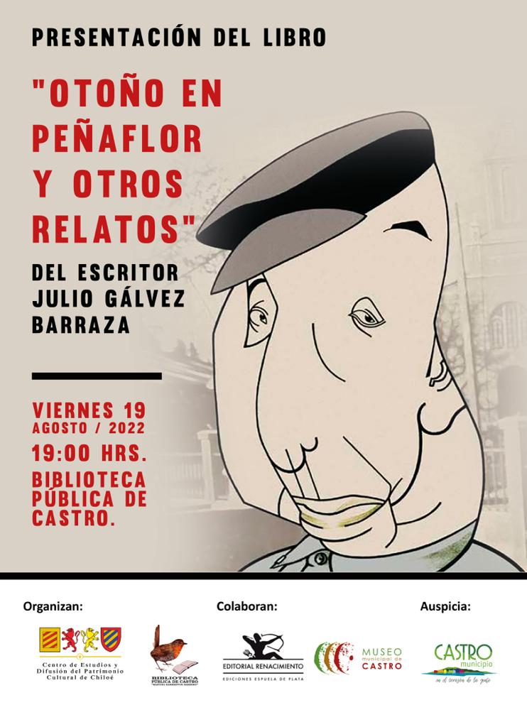 La Biblioteca Pública de Castro será el escenario para la presentación del Libro “Otoño en Peñaflor y otros relatos” del escritor, Julio Gálvez Barraza, iniciativa que cuenta con el apoyo de Castro Municipio, y el Centro de Estudios y Difusión del Patrimonio de Chiloé.