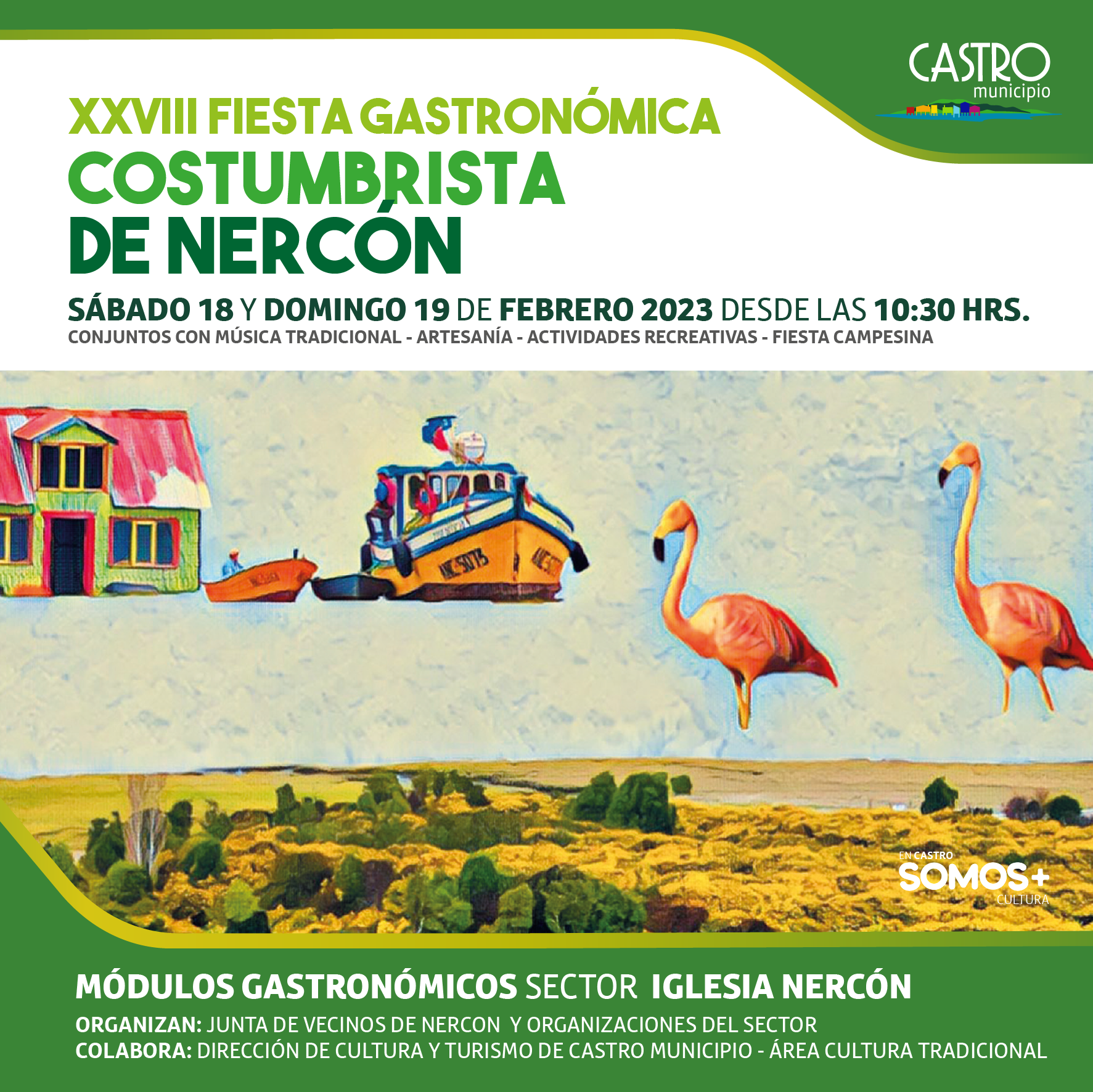 La XXVIII fiesta gastronómica y costumbrista de Nercón es organizada por la Junta de vecinos de Nercón, organizaciones del sector y la colaboración de la Dirección de Cultura y Turismo de Castro Municipio.