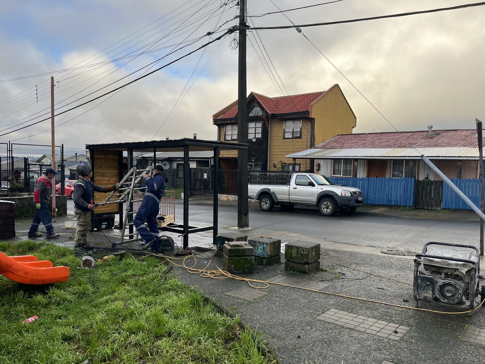 Junto al Consejo Vecinal de Desarrollo y el equipo del Programa Quiero Mi Barrio de Barrio Tejiendo Sueños de Castro, se realizó la visita a la Obra de Confianza que se está ejecutando en el sector de población Yungay, proyecto urbano que ya posee un 40% de avance y que contempla la reposición del paradero, veredas y la creación de un área verde a la entrada de la población.