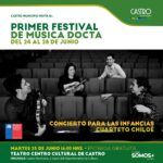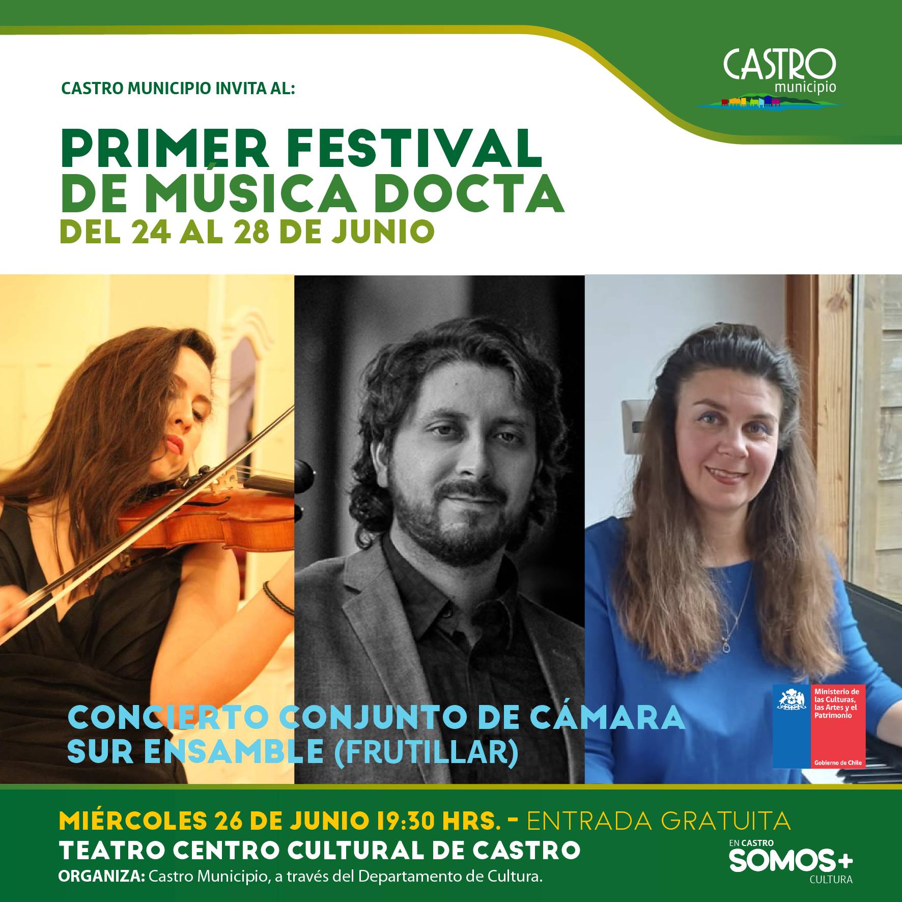 Rompiendo la estacionalidad y con la mirada puesta en abrir espacios a las diferentes expresiones artísticas y culturales, este mes de junio, el Centro Cultural de Castro se viste de gala para ofrecer el primer Festival de Música Docta. Del 24 al 28 de junio, la comunidad podrá disfrutar de las interpretaciones de destacados músicos nacionales e internacionales, gracias al patrocinio del Municipio de Castro, por medio de la Dirección de Cultura y Turismo.