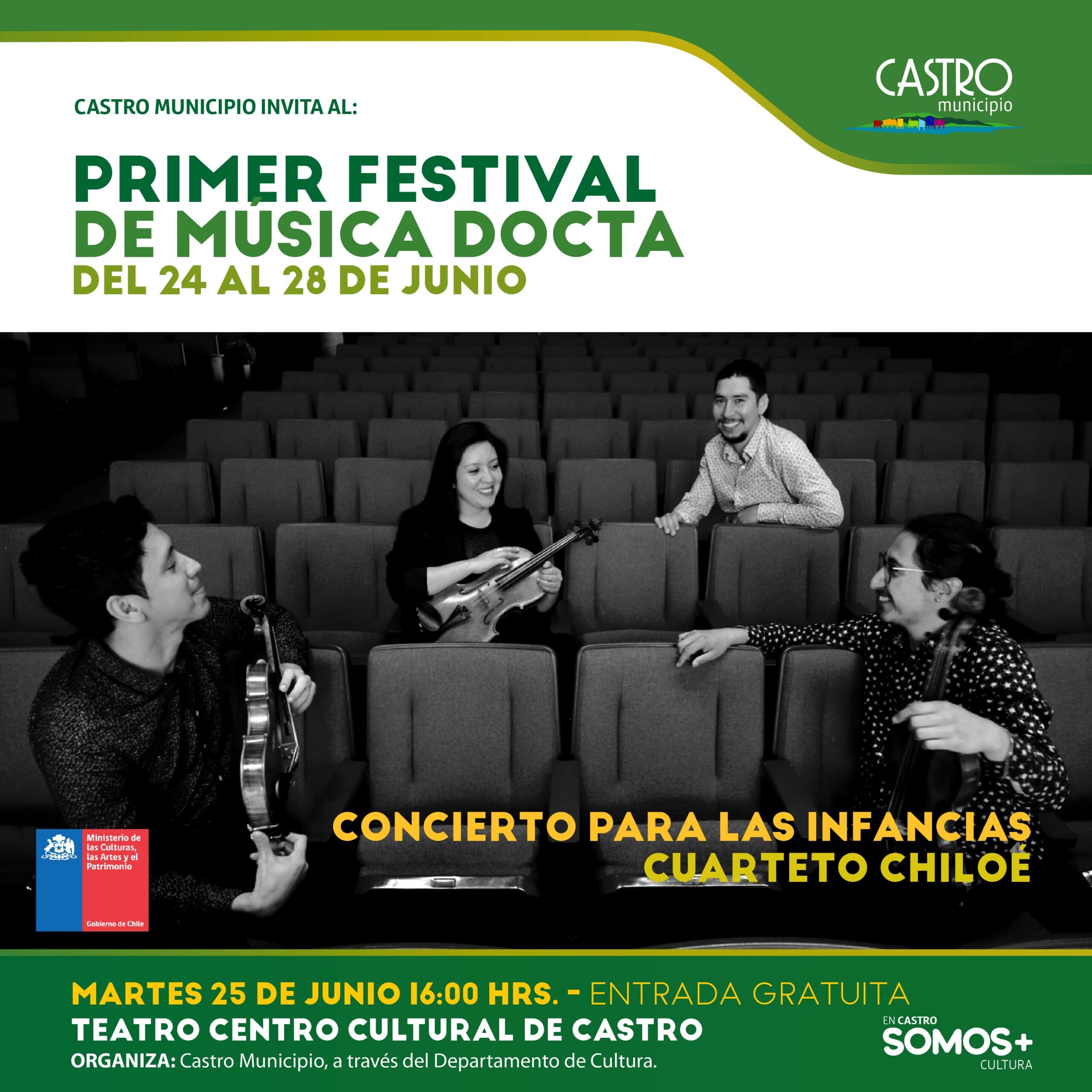 El Festival continua el martes 25 de junio con un concierto para las infancias del Cuarteto Chiloé, compuesto por Natalia Carrillo Miranda, José Astudillo, Ariel Sotomayor y Saruy Concha Villagrán. Esta puesta en escena permite que niños y niñas puedan disfrutar de la música siendo ellos mismos, sin la necesidad de estar en silencio o quietos.