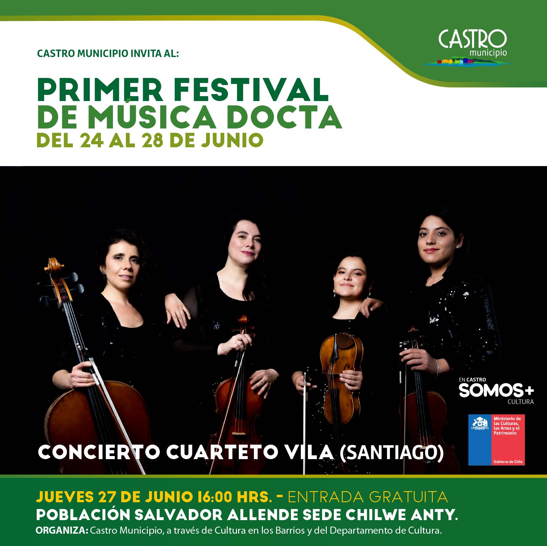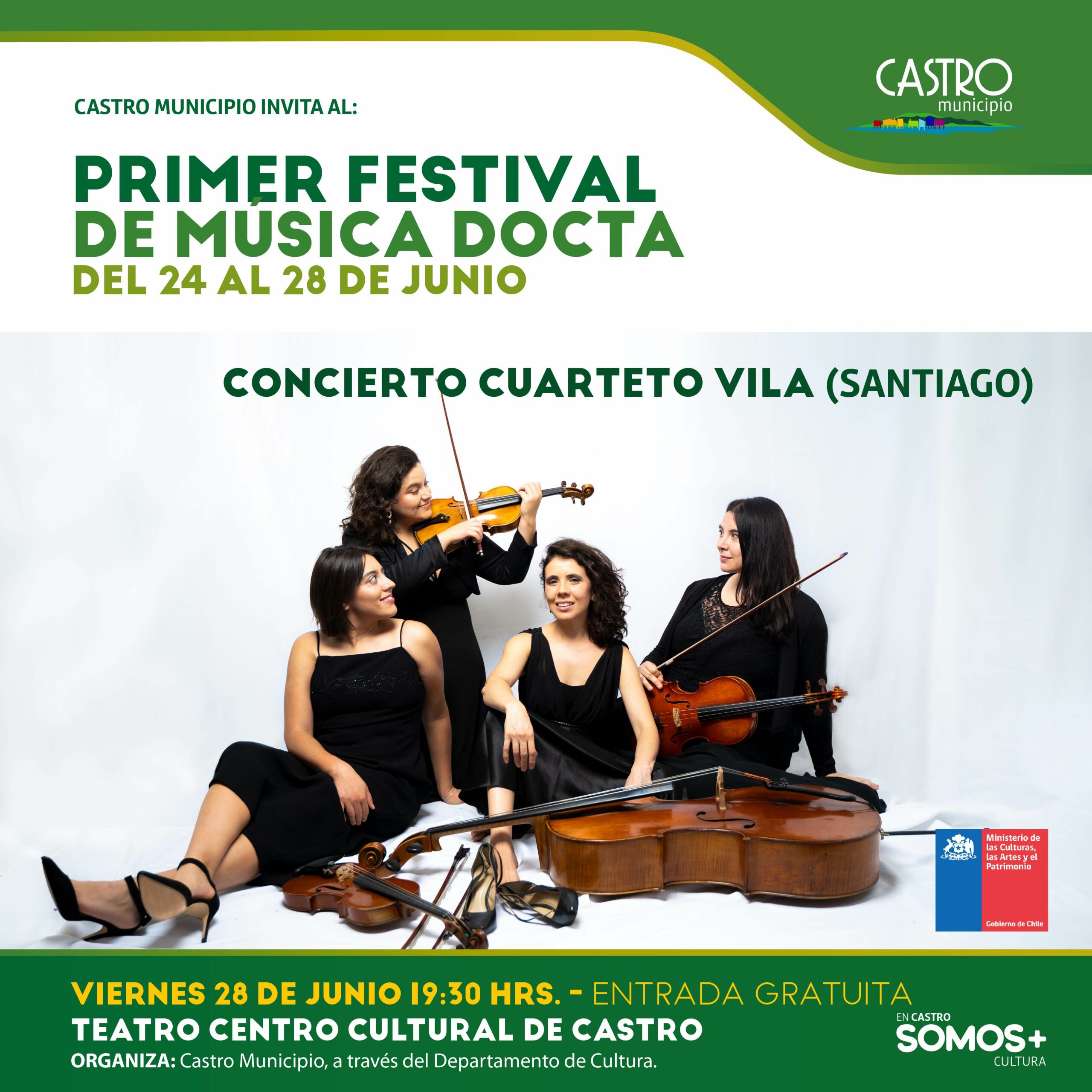 Para finalizar el Festival, el Cuarteto Vila, formado por las talentosas María Fernanda Morris, Lucia Ocaranza, Daluz Sepulveda y Violeta Mura, dará un concierto el día viernes 28 de junio, a las 19:30 horas, en el teatro del Centro Cultural de Castro.