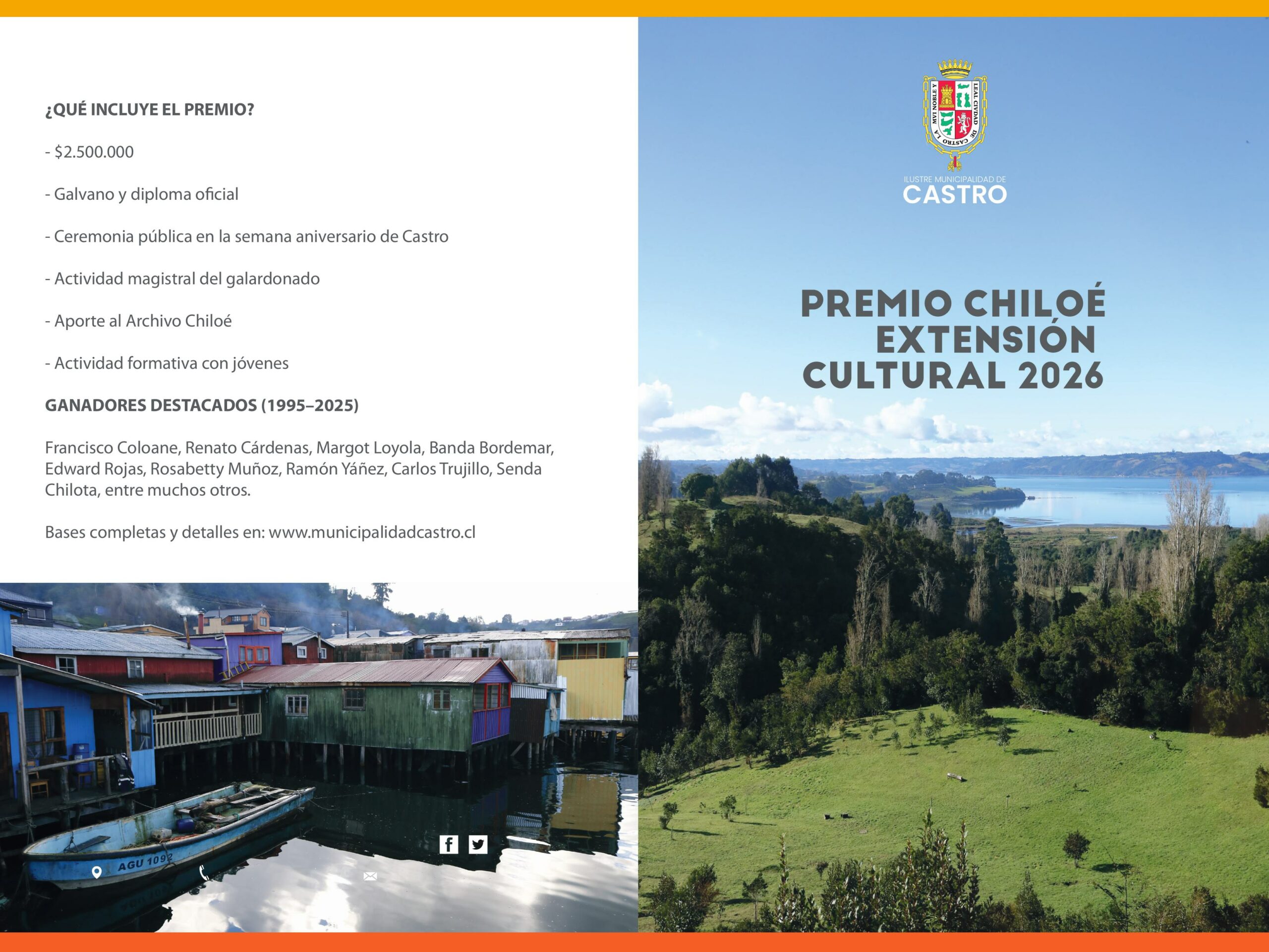 La Ilustre Municipalidad de Castro crea el 1995 el “Premio Chiloé de Extensión Cultural” como un reconocimiento en vida a destacadas personalidades e instituciones que hayan realizado aportes trascendentes al desarrollo, fortalecimiento y transmisión del patrimonio cultural del archipiélago chilote. Este premio busca visibilizar, valorar y perpetuar las contribuciones excepcionales al acervo cultural insular en sus múltiples manifestaciones.