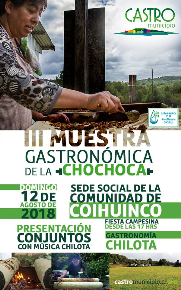Este próximo domingo continuarán las fiestas costumbristas en nuestra comuna, con la “Tercera Muestra Gastronómica de la Chochoca” y posteriormente La Fiesta Campesina, organizadas por los vecinos de la comunidad de Coihuinco con colaboración de Castro Municipio, a través de departamento de cultura.