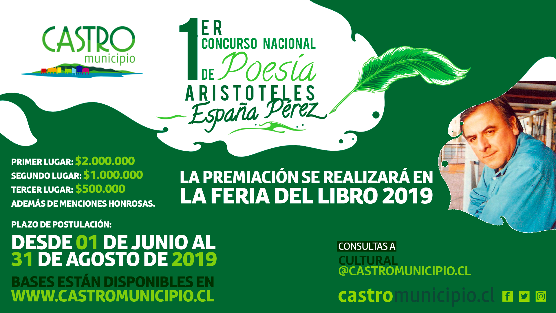 Con el objetivo de generar un nuevo hito cultural para Chile y el mundo con sede en Castro es que el municipio de la comuna de Castro ha gestado la primera versión del Concurso Nacional de Poesía Aristóteles España, certamen que busca premiar a poetas de todo el país en su participación con textos inéditos con extensión entre 450 a 650 versos.