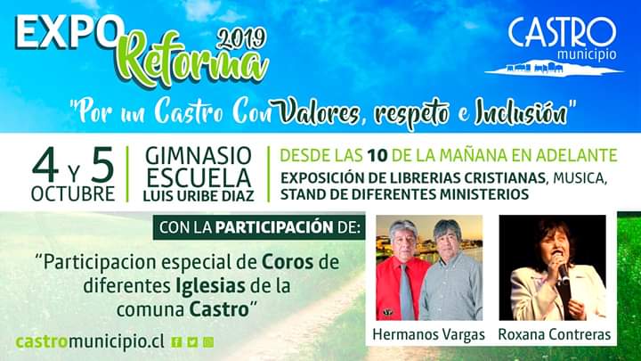 La tercera expo reforma 2019, organizada por la oficina de inclusión de Castro Municipio en conjunto con el apoyo de las iglesias evangélicas de la comuna, reunirá a más de 20 expositores culturales relacionados con temáticas cristiana de todo el país, que tendrán la oportunidad de dar a conocer la bibliografía y música existentes en Chile y el trabajo que desarrollan.